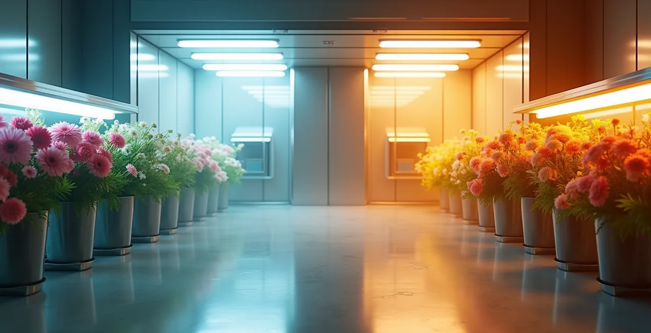 Para entender el impacto de la temperatura, debemos pensar en una flor cortada como un ser vivo con un metabolismo activo, aunque ya no esté conectada a la planta. A temperaturas bajas y controladas, como los 6ºC de una cámara frigorífica profesional, sus procesos vitales (respiración y transpiración) se ralentizan drásticamente. La flor entra en un estado de hibernación controlada, conservando su energía, agua y azúcares. Es el equivalente a poner el reloj de su vida en cámara lenta.